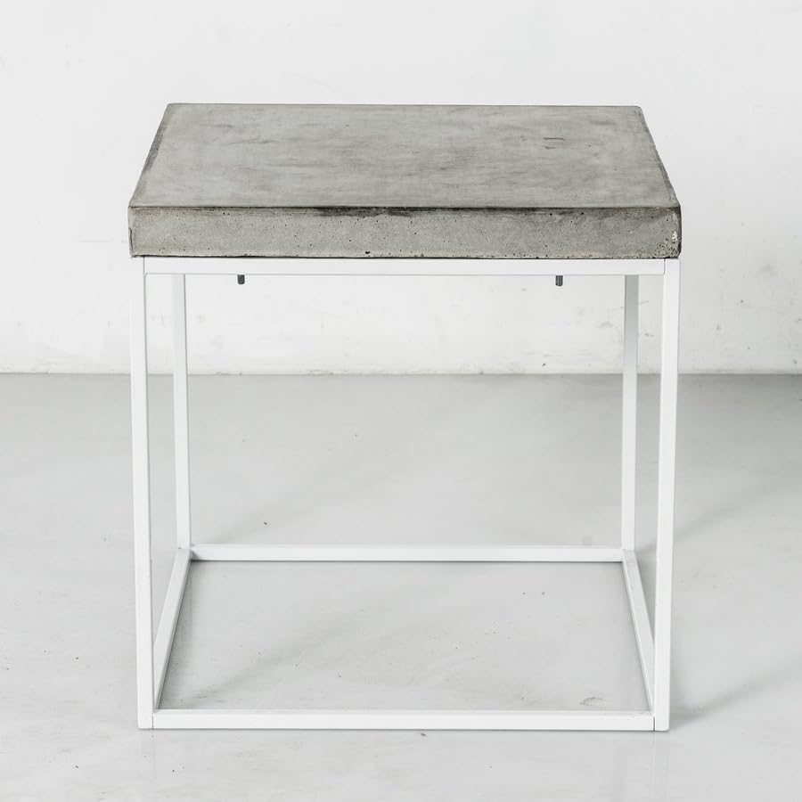 These tables are hand made in Los Angeles, California. They feature a steel base painted in silk white, topped with concrete that’s finished with a clear coat.